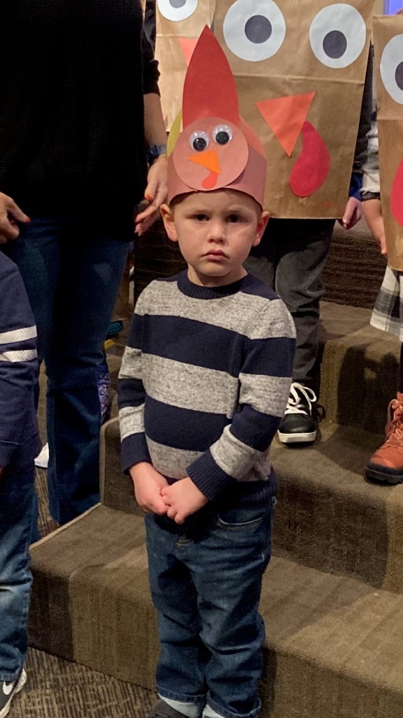 Next up, hez and Naomi had their preschool Thanksgiving program! If you know Hez, you know he is a pretty shy guy, but he stood up there the whole time!! He may not have sung a single word, or smiled at all, but I was so proud of him for standing up there with his class! Naomi did great, she loved to clap after each song and loved seeing her friend, Evie.