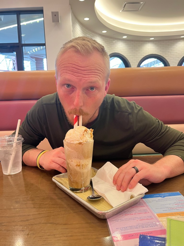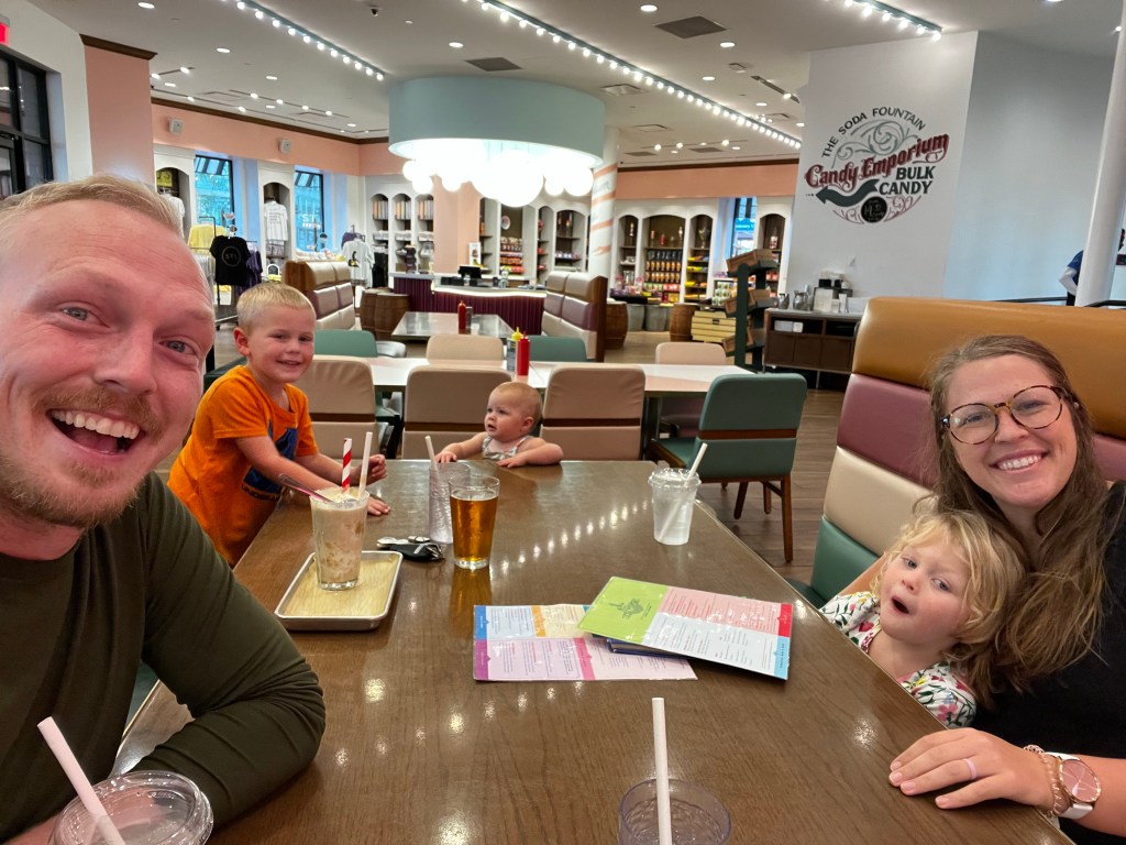 Then we headed to the Union Station for dinner. We went to a cute little sofa fountain restaurant. We were the only ones in there, which was ideal because our kids are wild, and the ice cream was delicious. They specialize in these big ol’ milkshakes (some including alcohol) and it was incredible. The union station in itself is pretty cool, there’s a big Ferris wheel, a carousel, mini golf, and a few food trucks. Since we went on a Wednesday evening, it wasn’t too crowded but I bet it fills up on a weekend. The activities were a bit pricey, but there was a train themed playground which my kids absolutely loved.