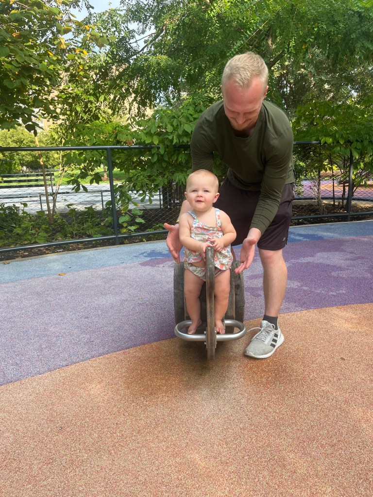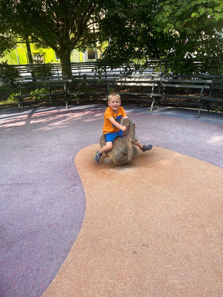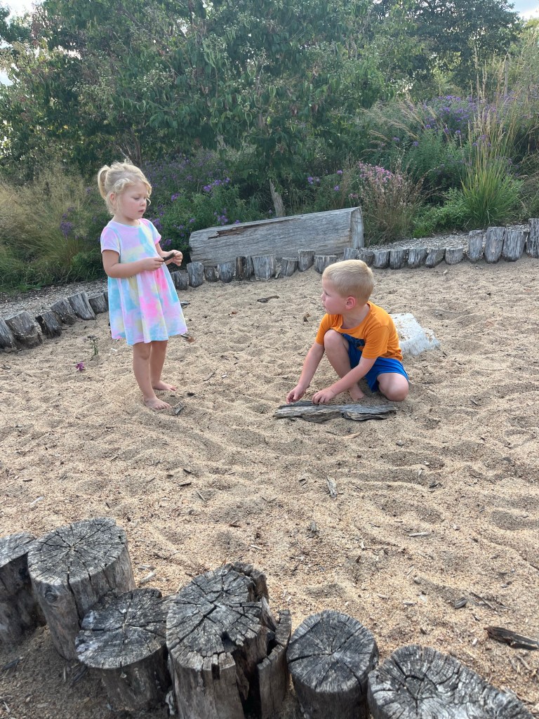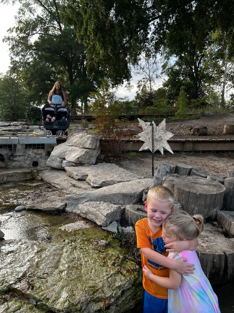 After nap time we went to the one of our favorite places we went to, and quite possibly the simplest! In Forest park (right next to the zoo) there is a big nature park. At first we were skeptical, most likely because we couldn’t understand the map and didn’t know where to go, but it was this huge area with different types of nature play areas. There were sand pits, prairies, a bunch of logs to climb on, and a little stream. The kids absolutely loved it. It was probably the most I had seen them play together in a while. When we got to the stream Hezzy asked like three times if he could get wet (we said yes each time) and meanwhile Naomi just hopped in. They honestly could have played there all day.